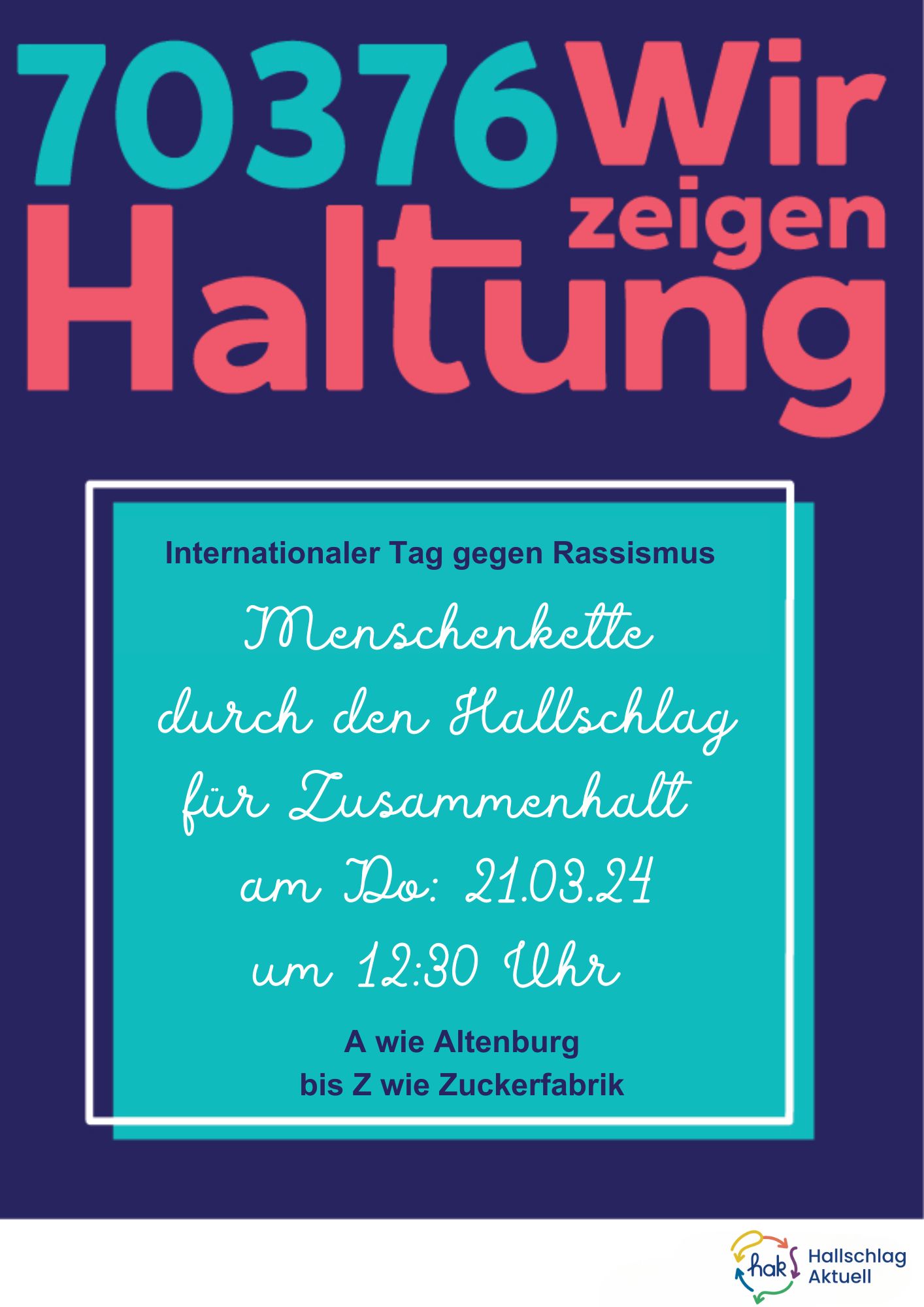 Unter dem Motto "70376 wir zeigen Haltung" werden wir am Donnerstag, 21.03.2024 um 12.30 Uhr eine Menschenkette von der Altenburg(schule) über die Carl-Benz-Schule ins Zentrum bis zu den Lessing-Schulen an der Zuckerfabrik bilden.