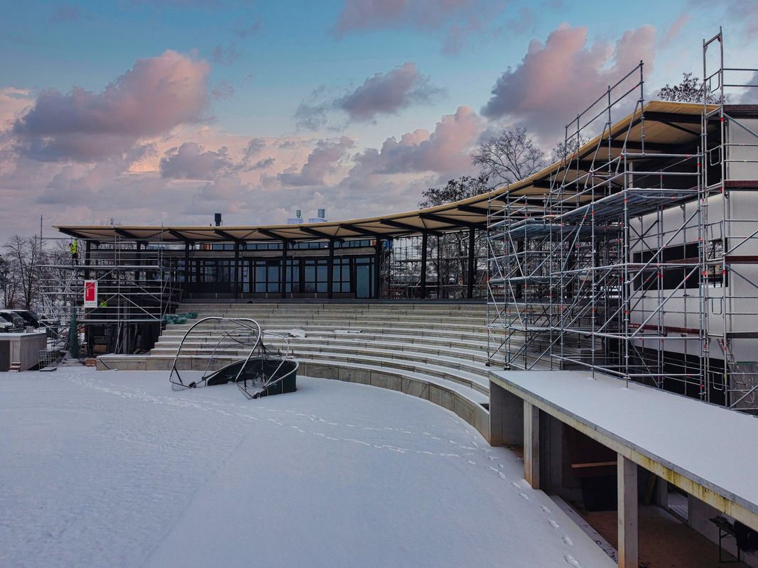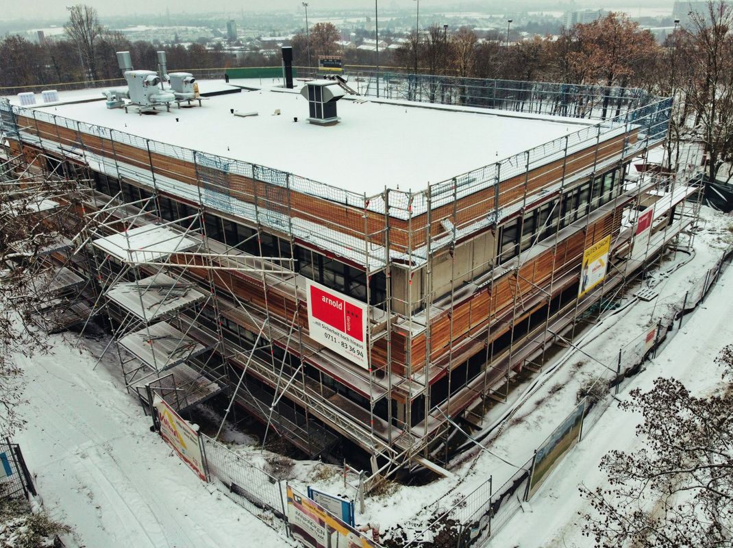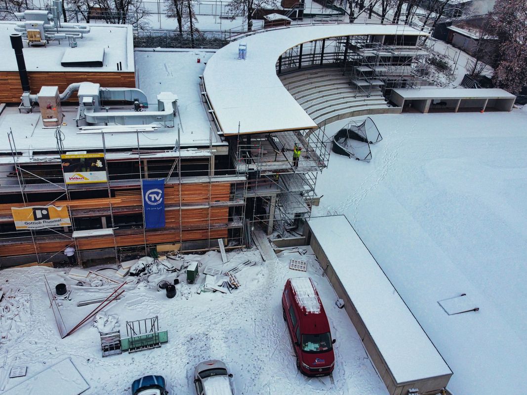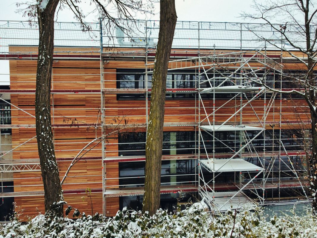 Dezember 2022 – Die hölzerne Fassade kommt und es liegt Schnee.