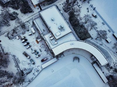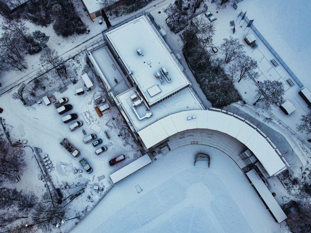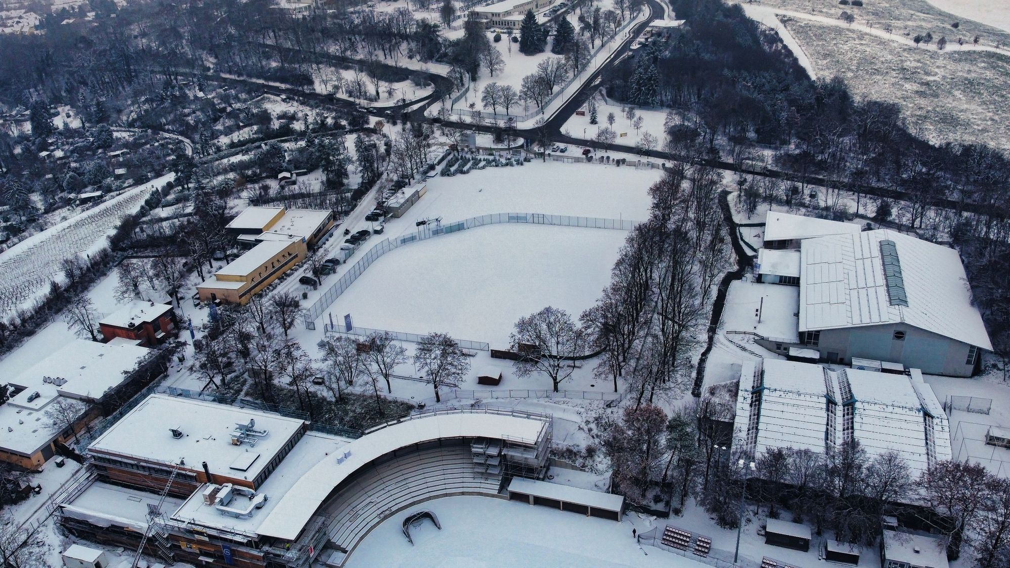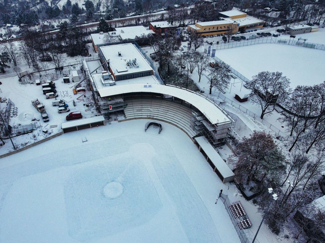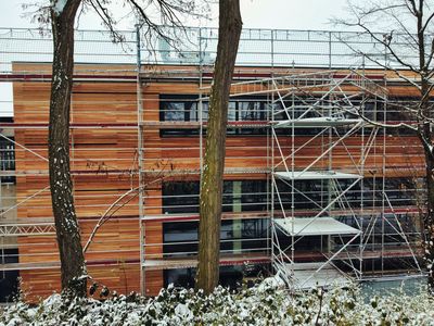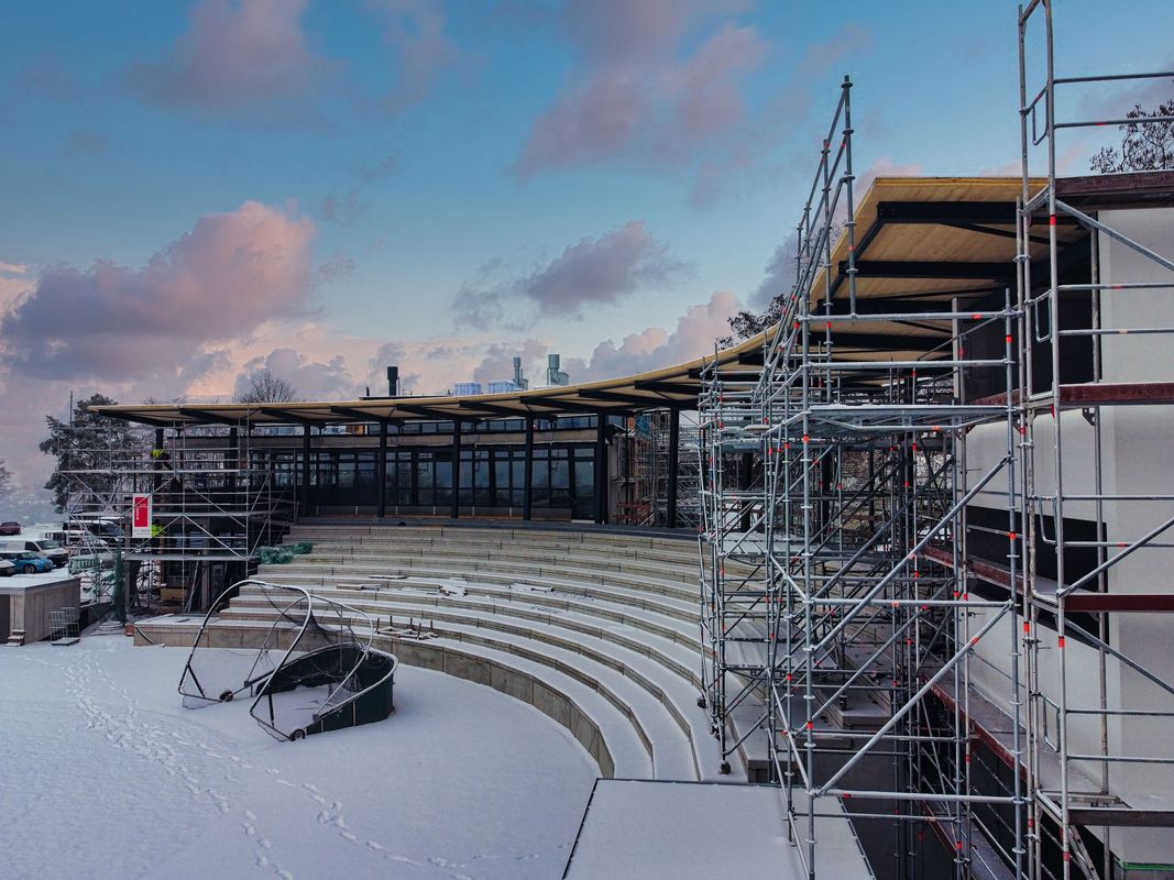 Dezember 2022 – Die hölzerne Fassade kommt und es liegt Schnee.