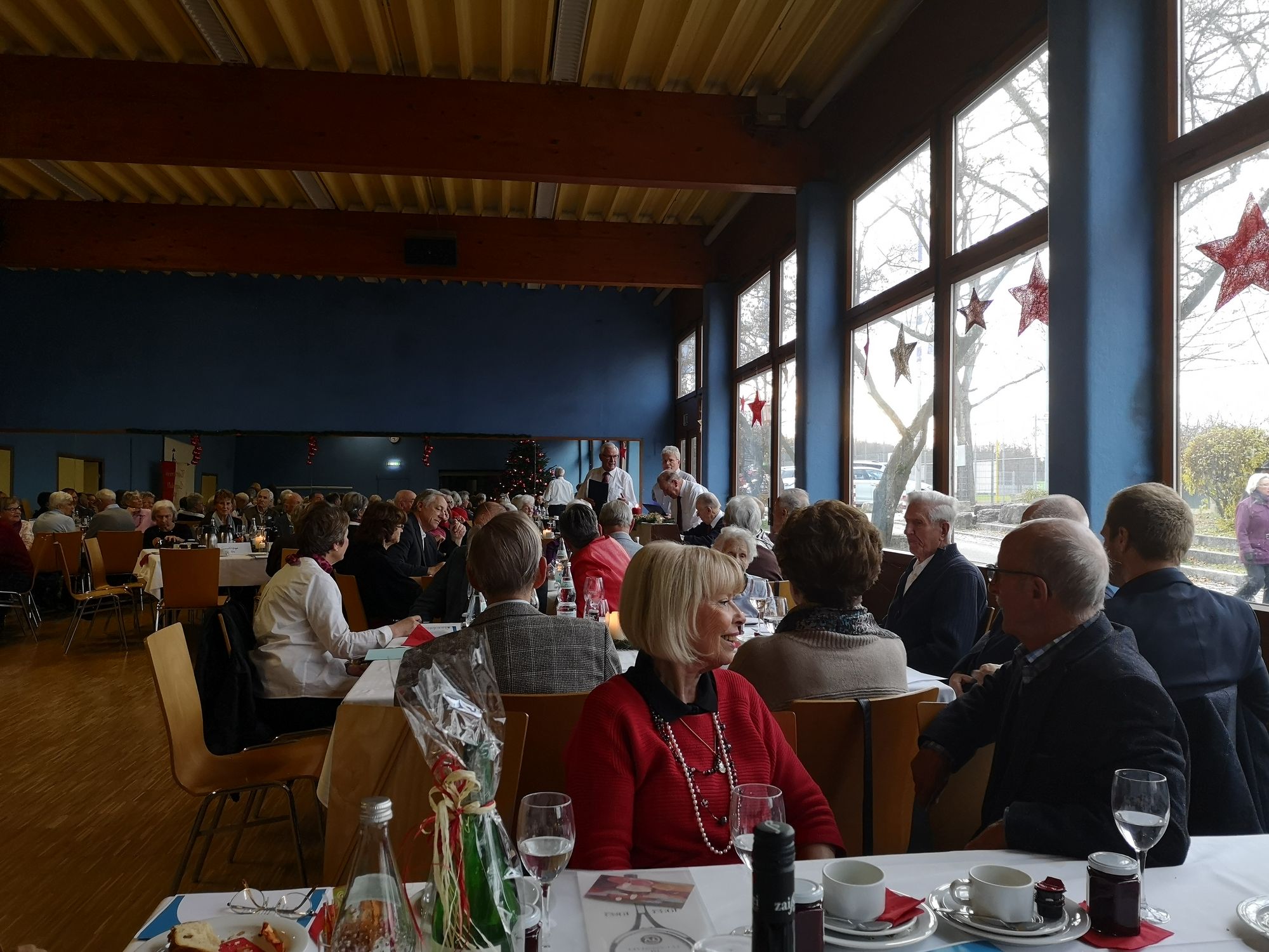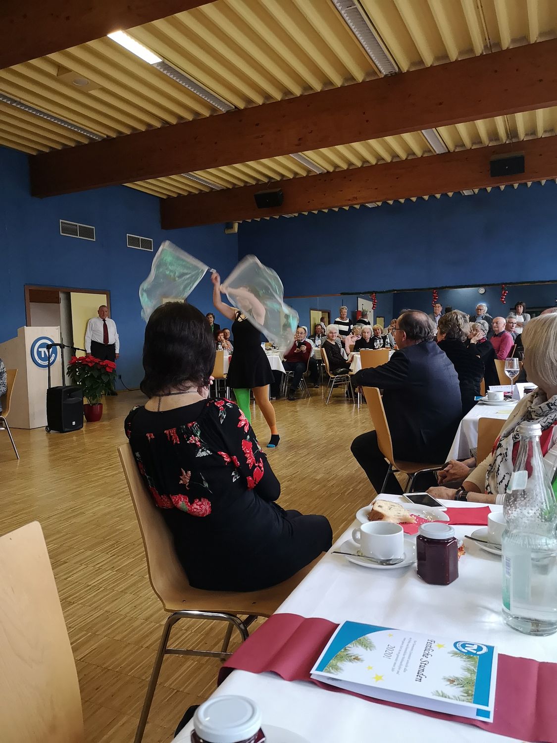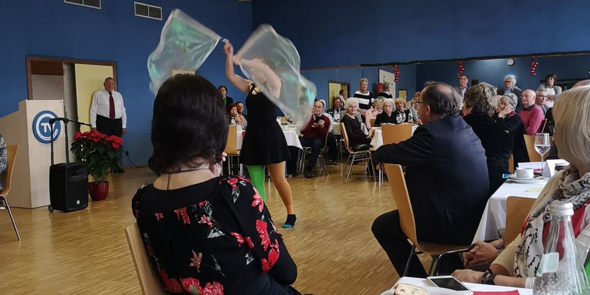 Nach dem Augenblick der Stille, bei dem der Toten gedacht wurde, nahm der Nachmittag mit einem schönen bunten Programm seinen Verlauf. Bei Kaffee und Kuchen und Wein vom Weingut Andreas Zaiß konnten die Gäste die künstlerischen und zugleich sportlichen Darbietungen des Circus Circuli bewundern, die vom Seniorenchor unter der musikalischen Begleitung von Josef Walter vorgetragenen Lieder genießen und selbst bei den Weihnachtsliedern mitsingen. Die beiden Soli von Joachim Rieger und Walter Munder begeisterten die Teilnehmer ganz besonders. Beim Weihnachtsrätsel konnten die Gäste ihr Wissen erproben und zusammen mit den Tischnachbarn das schwierige Lösungswort finden.