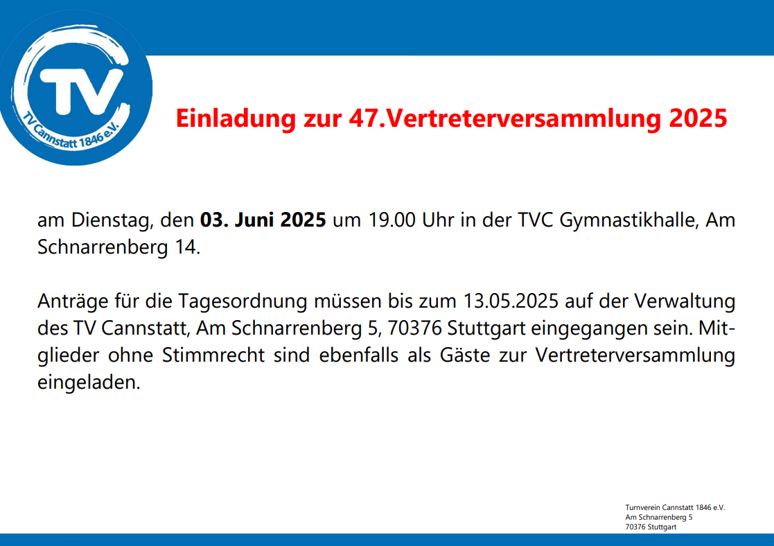 Anträge für die Tagesordnung müssen bis zum 13.05.2025 auf der Verwaltung des TV Cannstatt (Am Schnarrenberg 5, 70376 Stuttgart) eingegangen sein. Mitglieder ohne Stimmrecht sind ebenfalls als Gäste der Vertreterversammlung eingeladen.