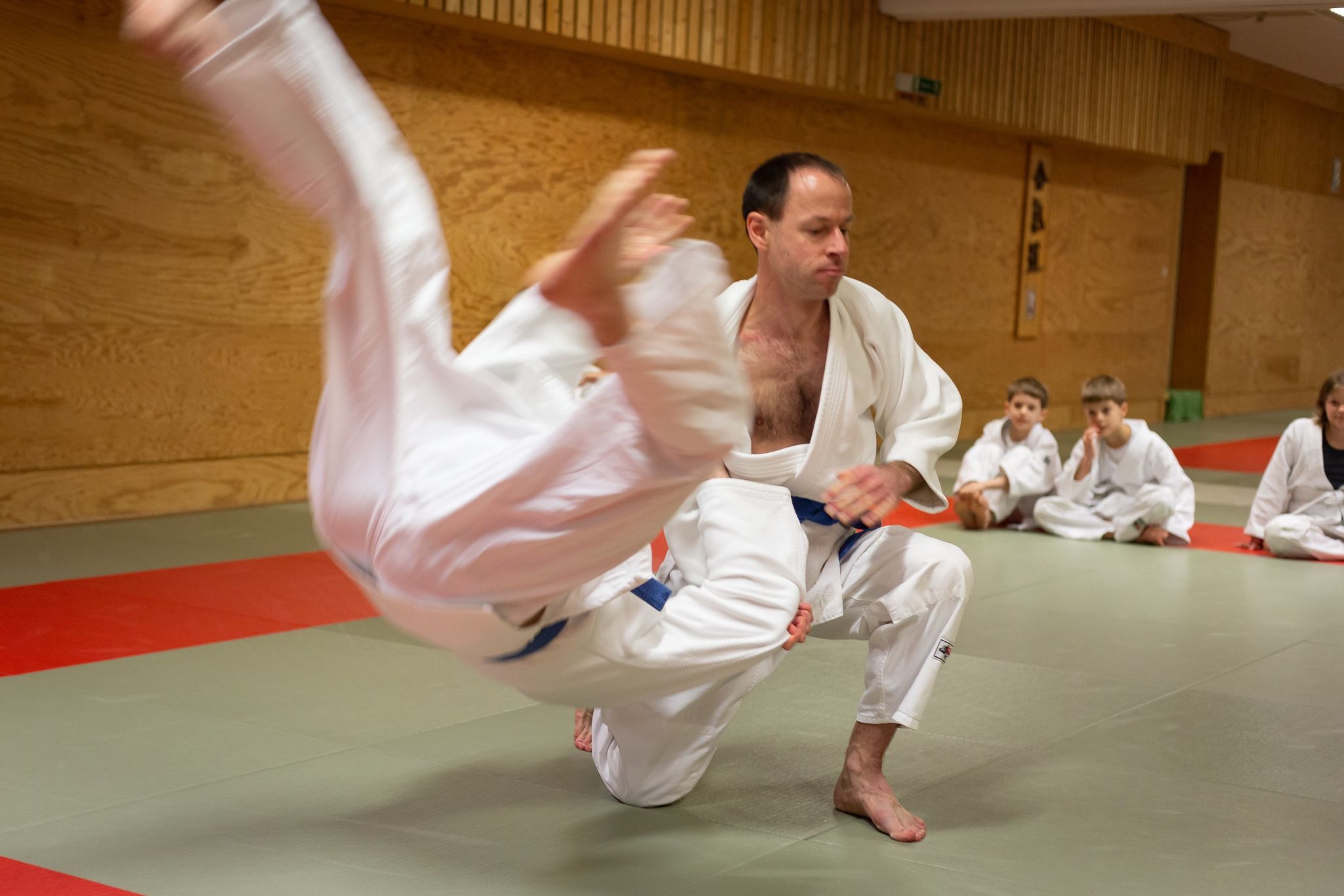 Die eigentliche Prüfung begann nach der Mittagspause zunächst mit den Kata-Vorführungen der Prüflinge zum blauen und zum braunen Gürtel, gefolgt von den weiteren Prüfungsfächern im Stand und Boden, die von allen Prüflingen absolviert werden mussten.