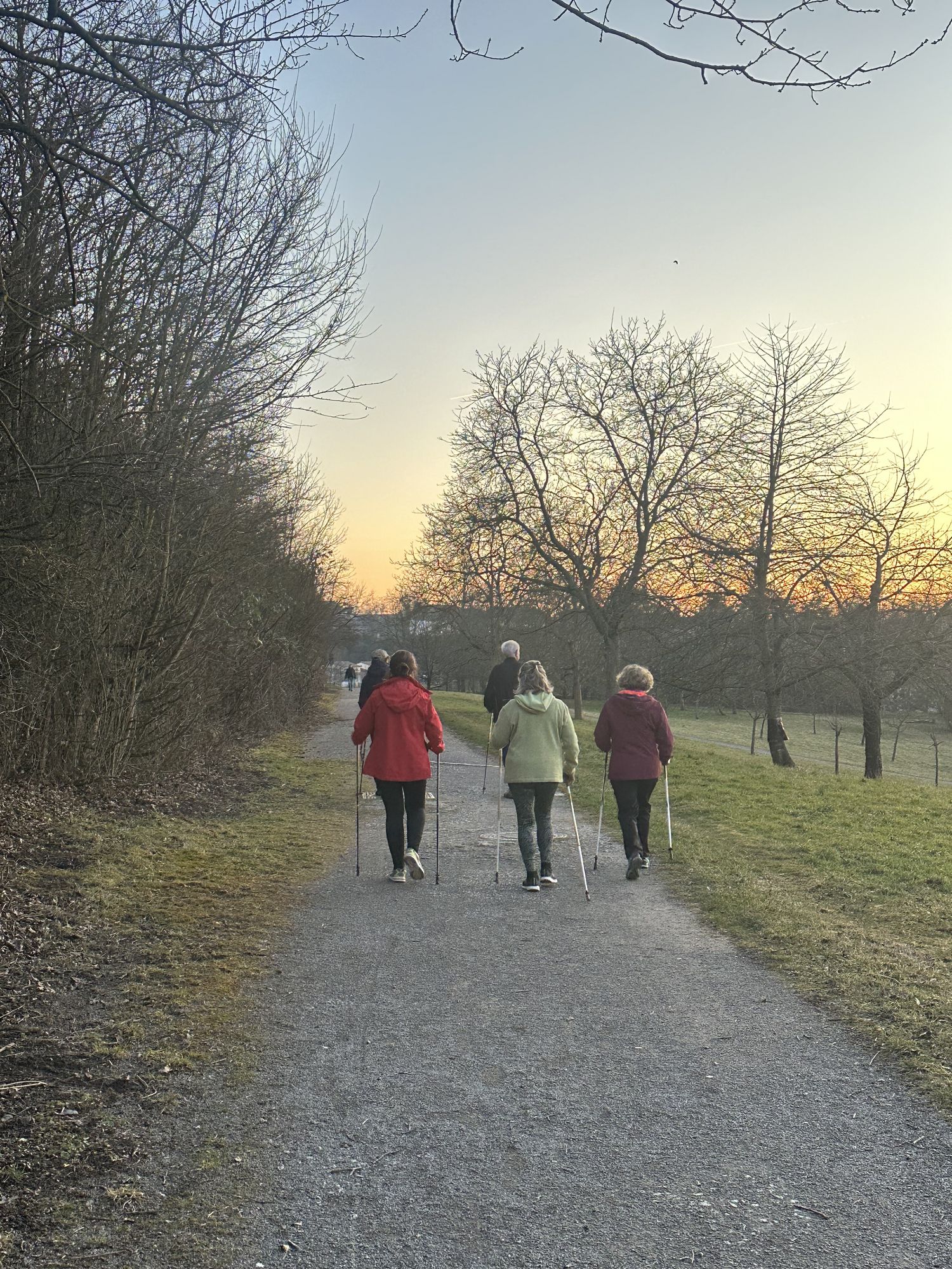 Dienstagabend, 17.00 Uhr: Unsere Nordic-Walking-Gruppe trifft sich bei fast jedem Wetter am unteren TVC-Parkplatz, gegenüber von den Robinson Barracks. Unter der Leitung von Katrin Beutenmüller, die seit fast zwanzig Jahren unsere Trainerin ist, machen wir uns erstmal einige Minuten warm. Dann starten wir unsere Runde über die Weinberge durchs Tapachtal, hoch zum Robert-Bosch-Krankenhaus oder runter an den Neckar und zum Max-Eyth-See.