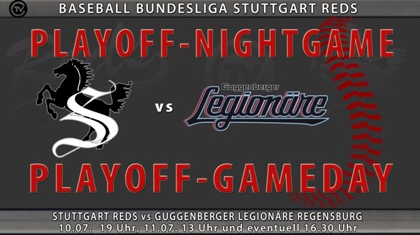 Am Samstagabend und am Sonntagnachmittag finden die nächsten Playoff-Begegnungen unserer Baseball-Bundesliga-Mannschaft statt! In der "Best-of-5" Serie steht es 1:1 unentschieden zwischen den Reds und den Guggenberger Legionären Regensburg. Nun folgen an diesem Wochenende die Spiele 3 + 4 und wenn notwendig auch ein fünftes Spiel. Los geht es am Samstag mit dem Nightgame um 19 Uhr, am Sonntag folgt um 13 Uhr das Spiel Nr. 4. Falls beide Teams bis dahin je 2 Siege haben, wird noch ein fünftes Spiel gegen 16.30 stattfinden!