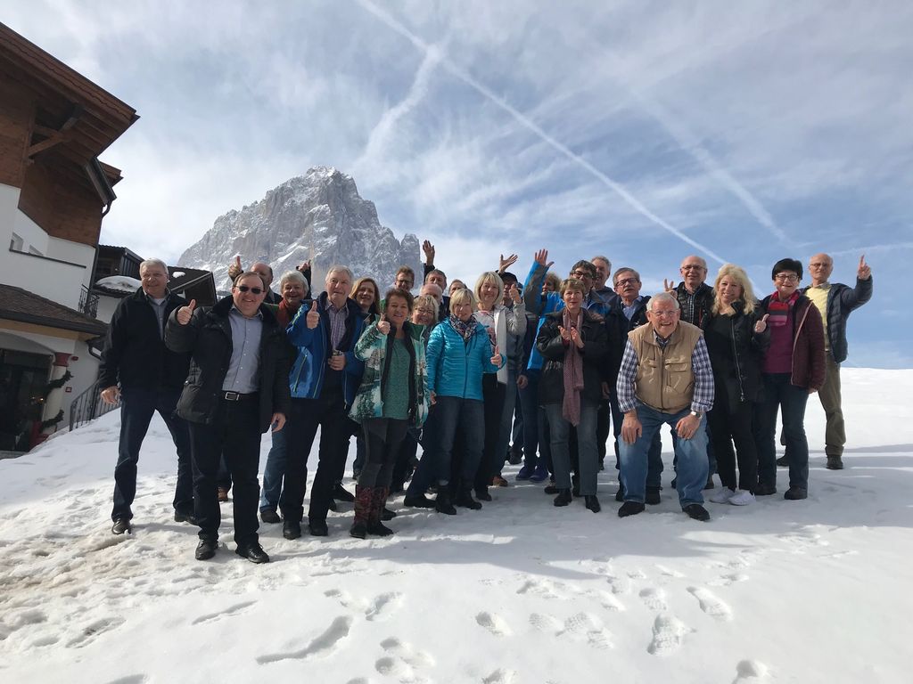 Trotz fortgeschrittener Jahreszeit ließen die Pisten rund um den Sellastock keine Wünsche offen. Bei optimaler Schneelage und bestens präparierten Pisten konnten sich die verschiedenen Gruppen, die jeweils von Skilehrern begleitet wurden, jeden Tag neue Strecken erobern. Egal welche Touren man wählte, man hatte stets die imposante Bergwelt der Dolomiten im Blick. Bei häufigem Sonnenschein und Temperaturen leicht unter dem Gefrierpunkt waren Abfahrten bis ins Tal möglich, trotz des sich ankündigenden Frühlings. Auch die Mittagspausen konnten vor den zahlreichen urigen Hütten in einem geschützten sonnigen Plätzchen zur Erholung genutzt werden. Dabei gab reichlich Auswahl an köstlichen regionalen Speisen.