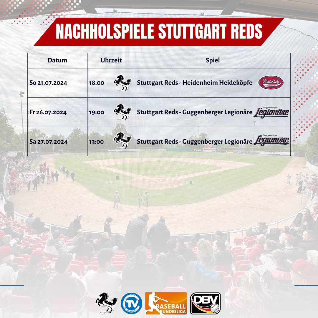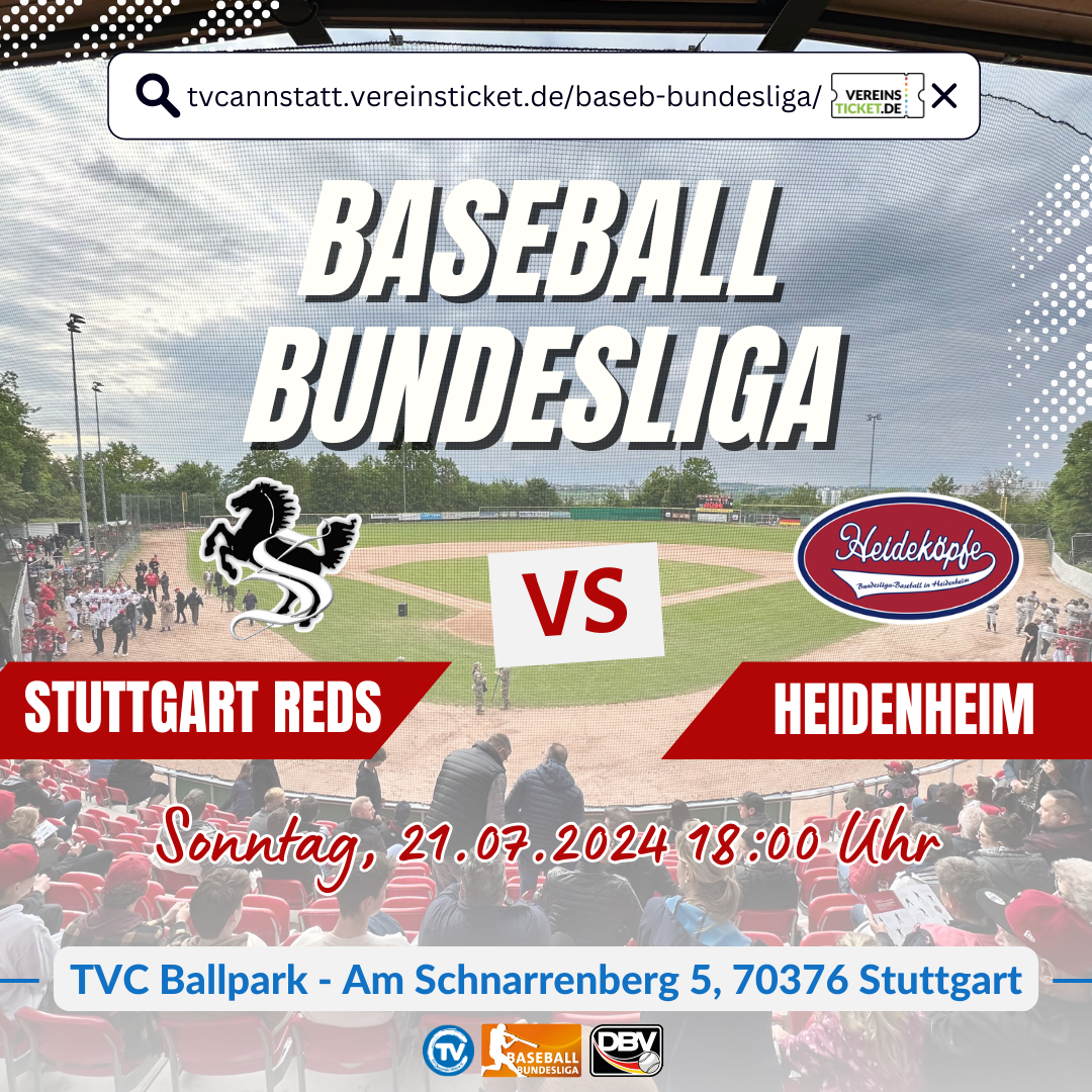 Freuen Sie sich auf ein spannendes Nachholspiel im TVC Ballpark, wenn die Stuttgart Reds auf die Heidenheim Heideköpfe treffen. Dieses Spiel verspricht, eine packende Begegnung zu werden, bei der beide Teams alles geben werden. Unterstützen Sie die Reds in diesem wichtigen Match und erleben Sie Baseball der Spitzenklasse in einer fantastischen Atmosphäre.