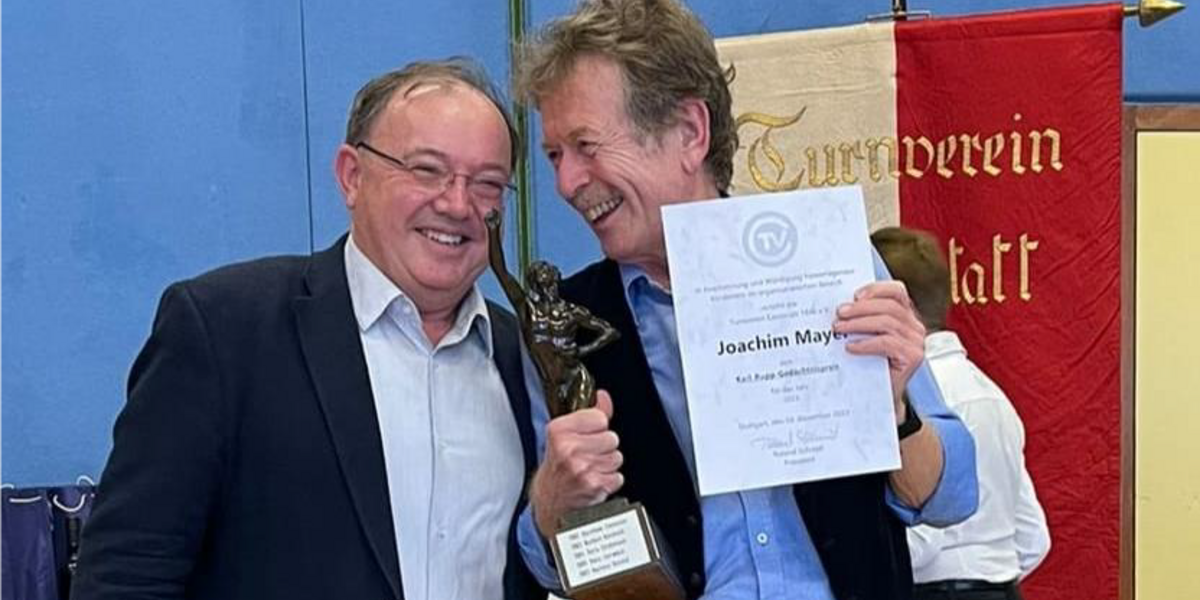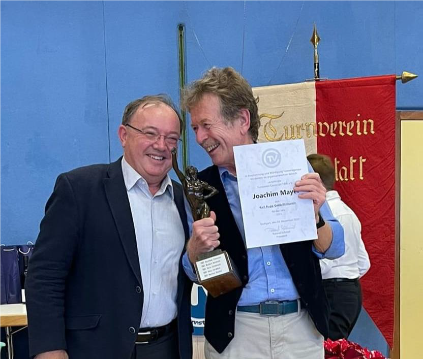Und – das Jahr 2023 hatte für Joachim Mayer ein weiteres Highlight parat: Bei der Jahresabschlussfeier des TVC, den „Festlichen Stunden“, am 3. Dezember 2023 wurde ihm eine besondere Ehrung zuteil. Joachim Mayer wurde der „Karl-Rupp-Wanderpreis“ verliehen. Der Karl-Rupp-Wanderpreis wird für herausragende Leistungen im organisatorischen Bereich des Turnverein Cannstatt 1846 e.V. verliehen. Wer hat das mehr verdient als er! Denn er hat stets nicht nur die Interessen der Tennisabteilung im Sinn. Er hat immer einen Blick für das Ganze, für den ganzen Verein. Wegen seines konstruktiven Denkvermögens und wegen seines Weitblicks ist er sicher nicht immer ein „einfacher“ Abteilungsvorstand im Gefüge des Hauptvereins gewesen. Aber von der Geschäftsführung des Gesamtvereins wird Joachim Mayer genauso geschätzt wie von allen anderen Vorständen im TVC.