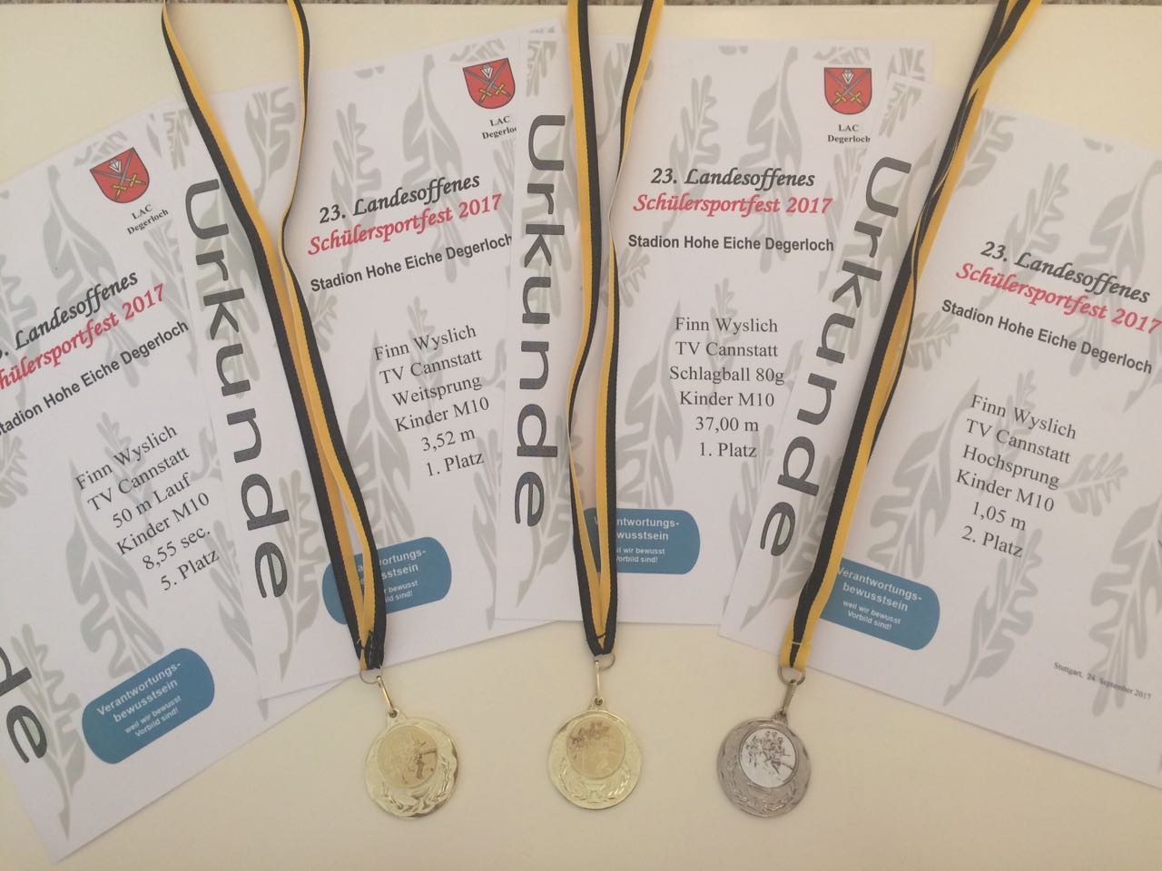 Bei strahlendem Sonnenschein konnte der LAC Degerloch sein Sportfest am Sonntag starten. Das große Teilnehmerfeld sorgte für eine Anzahl von spannenden Wettkämpfen. Auch einer unser Youngster aus der Leichtathletikabteilung, Finn Wyslich war mit dabei. Sein erster Wettbewerb in der Jahrgangsstufe M10 /M11 war mit insgesamt 15 Teilnehmer stark besetzt. Finn startete um halb 10 mit Ballwurf. Gleich beim ersten Wurf gelang es ihm den Ball auf sehr gute 37 Meter zu werfen. Seine Konkurrenten hatten damit eine schwere Nuss zu knacken und arbeiteten sich in kleinen Schritten an die gesetzte Topmarke ran. Zum Schluss war diese aber auch vom zweit platzierten nicht zu erreichen. Finn gewann mit 3 Meter Vorsprung!