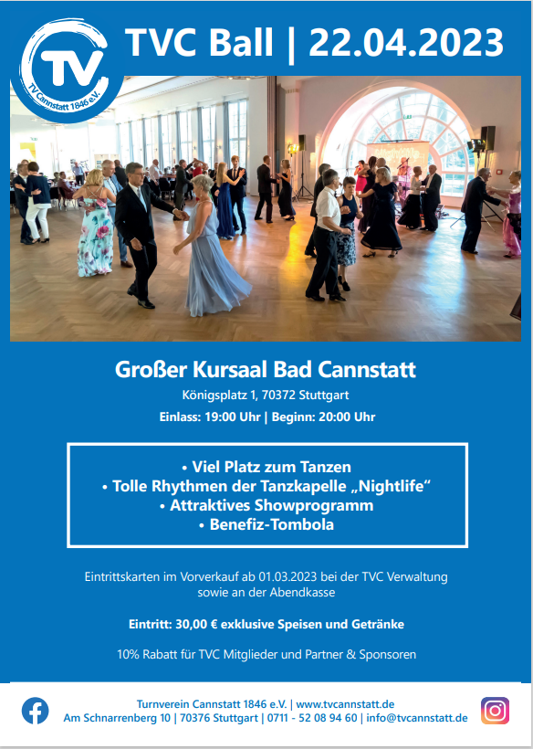Seien Sie dabei beim TVC-Ball im Großen Kursaal Bad Cannstatt in Stuttgart am 22. April 2023! Es erwartet Sie eine unvergessliche Nacht voller Tanz, Musik und Showprogramm.