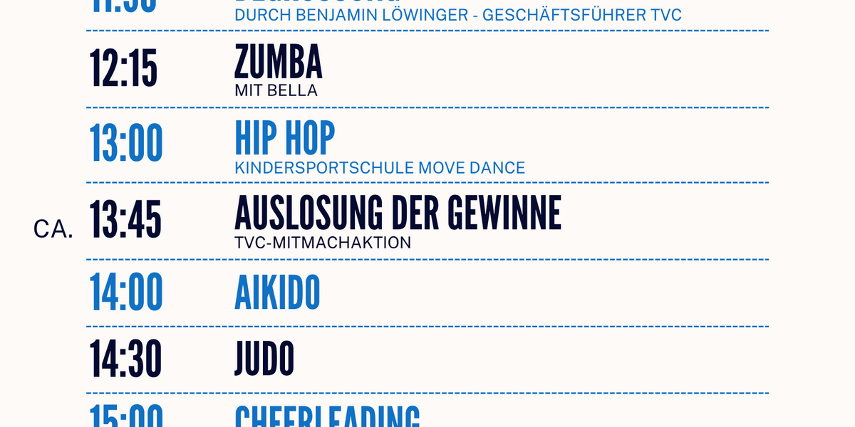 Am Samstag starten wir um 11:30 Uhr mit der offiziellen Begrüßung durch unseren Geschäftsführer Benjamin Löwinger. Danach folgen mitreißende Programmpunkte wie Zumba mit Bella, Hip Hop der Kindersportschule, spannende Vorführungen aus Aikido, Judo & Cheerleading, sowie eine Kinderdisko zum Auspowern. Zwei Gewinnauslosungen runden den Tag ab!
