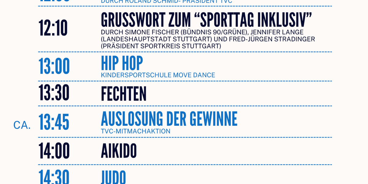 Der Sonntag steht unter dem Motto „Sporttag inklusiv“: Nach der Begrüßung durch Präsident Roland Schmid begrüßen wir u. a. Simone Fischer (Bündnis 90/Die Grünen) und Vertreter*innen aus Stadt & Sportkreis. Freut euch auf ein vielseitiges Programm aus Hip Hop, Fechten, Mitmachaktionen und Kinderdisco, das für alle offen ist – unabhängig von Alter oder Einschränkungen.