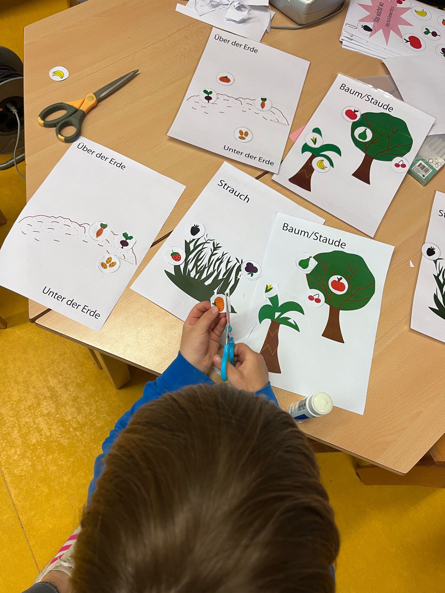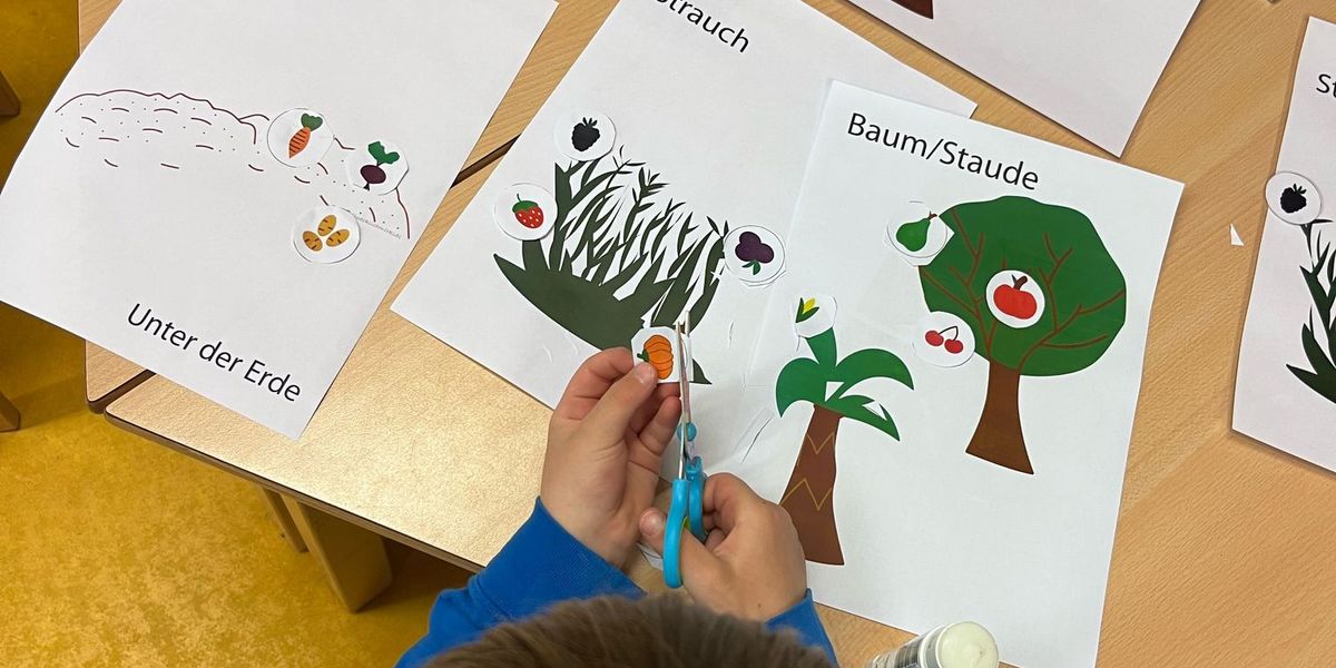 Ein „Was wächst wo?“ Quiz wurde erstellt und mit den Kindern bearbeitet. Hier durften die Kinder verschiedene Obst und Gemüsesorten ausschneiden und diese Richtig zu Bäumen, Sträucher, Stauden und „unter oder über“ der Erde zuordnen.
